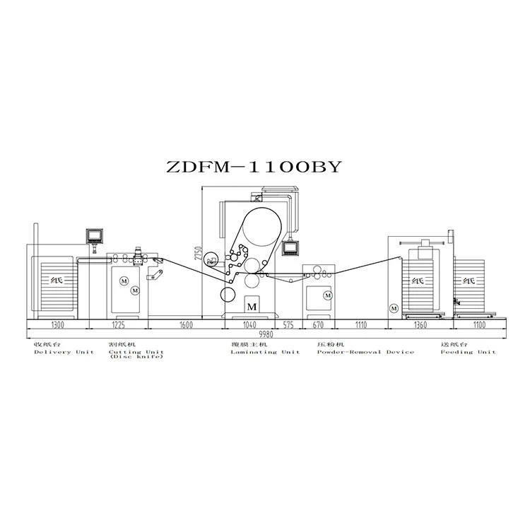 కాగితం కన్వేయర్ ద్వారా ప్రింటెడ్ మ్యాటర్ ముందు పేర్కొన్న స్థానానికి చేరవేసి, ఆపై ఫీడ్ చేయబడుతుంది. ఫిల్మ్ ఫీడింగ్ డివైజ్ ద్వారా ఫీడ్ చేయబడుతుంది, జిగురుతో పూత పూసి ఎండబెట్టబడుతుంది. కాగితం మరియు చలనచిత్రం విద్యుదయస్కాంత తాపన రోలర్ మరియు రబ్బరు కంప్రెషన్ రోలర్ ద్వారా ఒత్తిడి చేయబడి, ఆపై లామినేట్ చేయబడతాయి. కత్తి డిస్క్ లేదా రాపిడి కాగితపు చక్రాన్ని ఉపయోగించి కాగితంపై అతివ్యాప్తి చెందుతున్న భాగాన్ని కత్తిరించండి మరియు పేపర్ పుల్లింగ్ రోలర్తో కాగితాన్ని వేరు చేయండి. ఆపై వేరు చేయబడిన పూర్తి ఉత్పత్తులు ఒకే పూర్తయిన ఉత్పత్తులను సేకరించడానికి కన్వేయర్ బెల్ట్లో ఆటోమేటిక్ పేపర్ రిసీవింగ్ మరియు స్టాకింగ్ సిస్టమ్కు పంపబడతాయి.